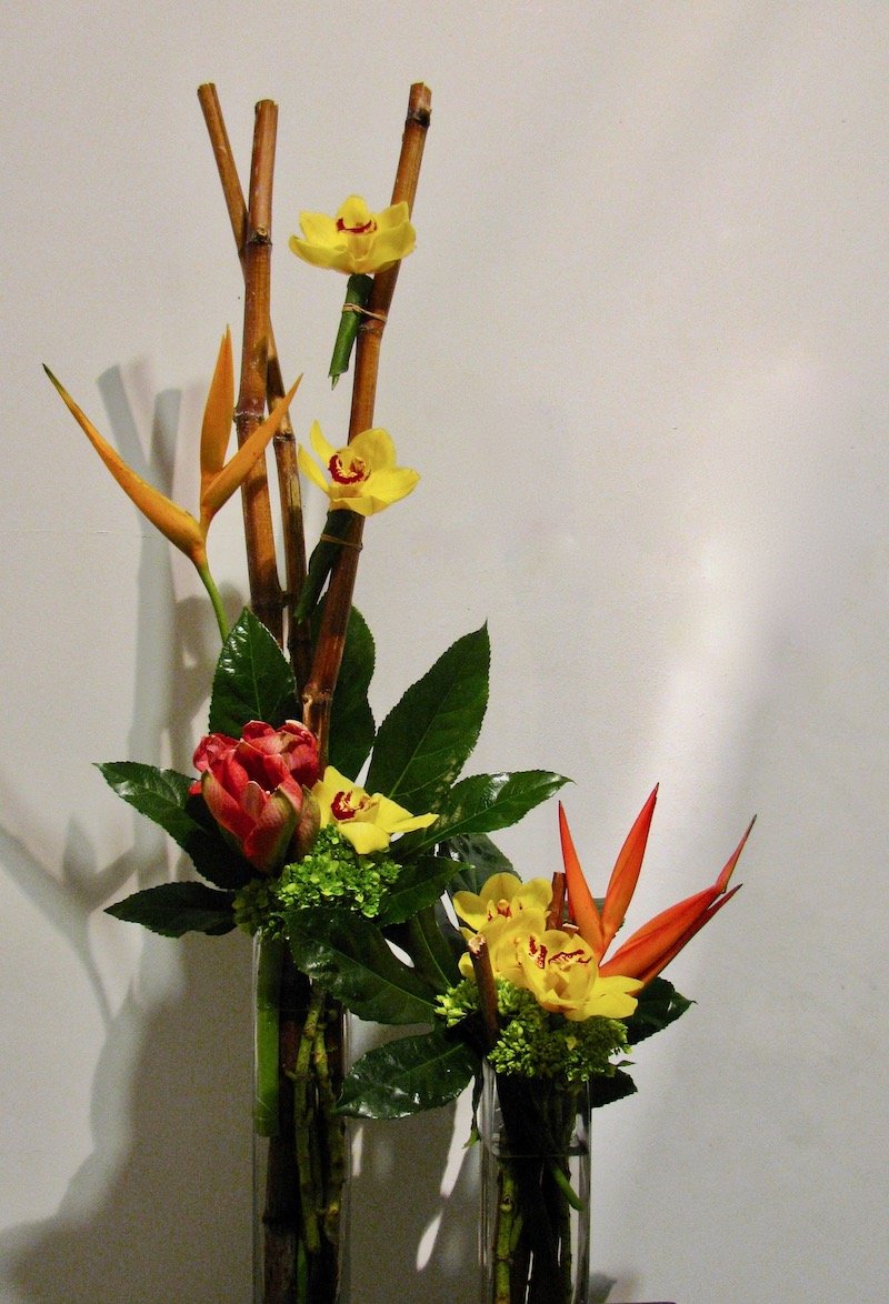 orchidée, amaryllis, opale, oiseaux paradis, épuré arrangement, tropical, corporatif, contemporain