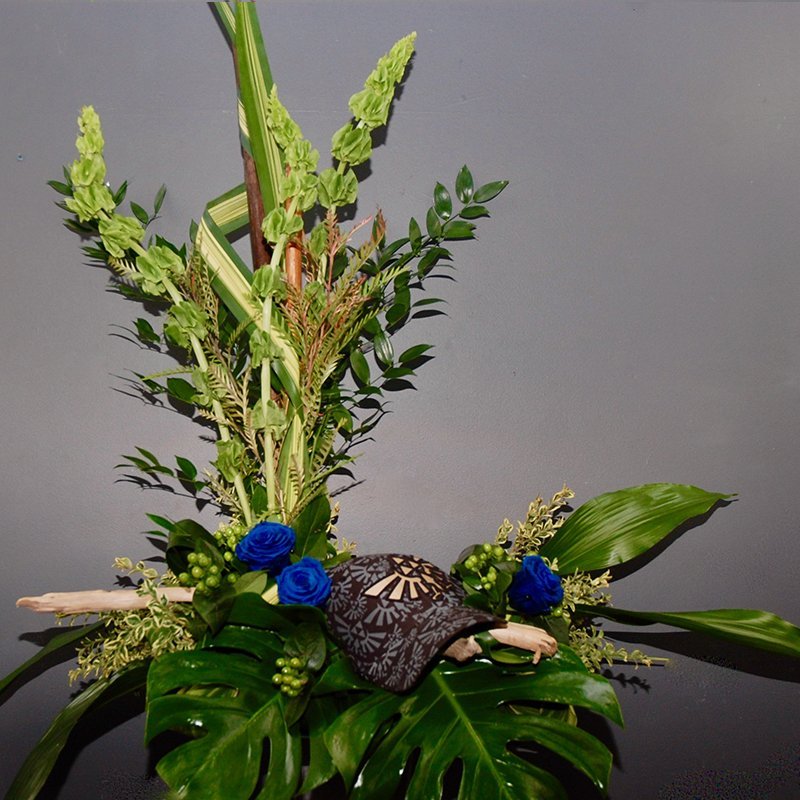arrangement urne, bleu, funéraire, monochrome, rose éternelle, vert